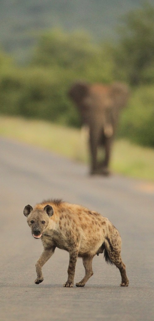 This is what it looks like when an Elephant is photobombing a Spotted Hyena picture 😊