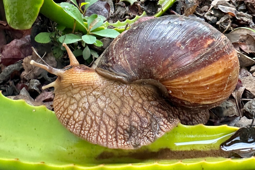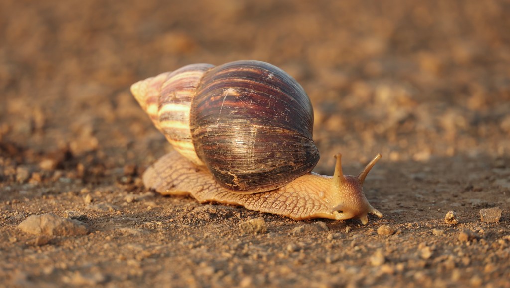 The African Giant Land Snail (Lissachantina fulica) is native to East Africa, but is an invasive species in many parts of the world, where it has been introduced by humans either as a possible food source, for the pet trade, or just by accident. In these areas it is considered a pest of agriculture and households.