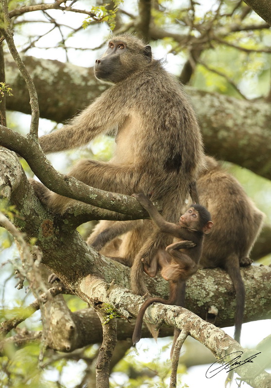 Today I was the first time in famous Hluhluwe/iMfolozi Game Reserve. I had many good sightings (Elephants, White Rhinos, Buffalo Giraffe, …). But my favorite pictures of today are of Chacma Baboons. I watched a family while they were bedding down in a tree for the night.