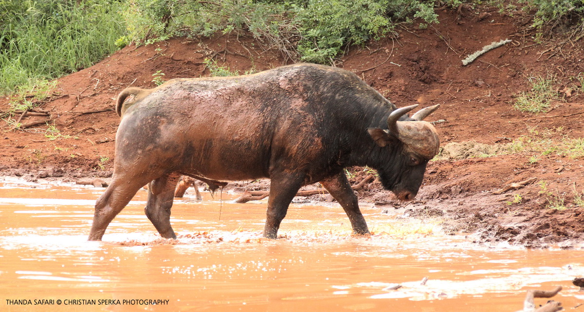 Dugga Boy is a nickname given to older Buffalo males who have passed their prime breeding age and spend their days wallowing in mud pools. Dugga boys occur in small bachelor herds or as individuals. They are quite vulnerable and therefore more aggressive than animals in a large herd. This Thanda Dugga Boy had a good stretch before he left the Ubomvu waterhole. Ubomvu means red in the local Zulu language – a very good name considering the red soil in this area!