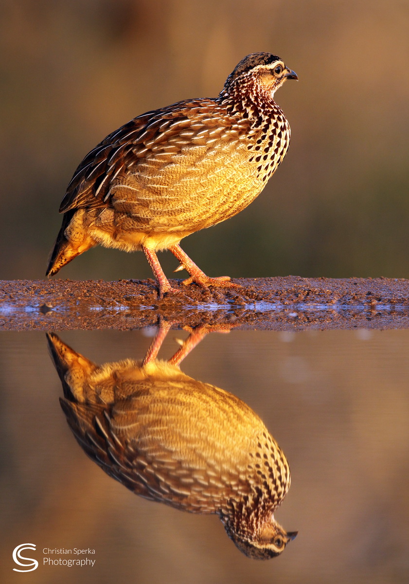 A Crested Francolin and its reflection at Mkhombe, Zimanga Private Game Reserve’s morning-light-reflection-pool-hide.