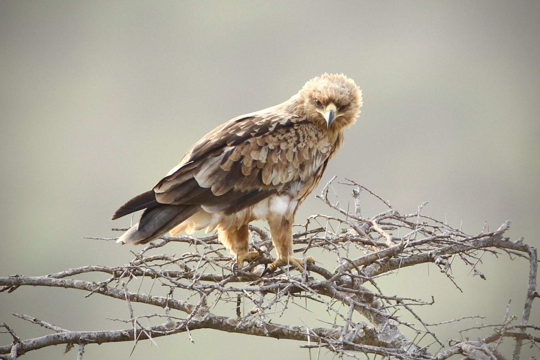 The African Fish Eagle is a large bird, and the female, at 3.2-3.6 kg (7-8 lbs) is larger than the male, at 2-2.5 kg (4.4-5.5 lbs). The adult is very distinctive in appearance with a mostly brown body with a white head like the Bald Eagle and large, powerful, black wings. The plumage of the juvenile is brown in colour, and the eyes are paler compared to the adult. The feet have rough soles and are equipped with powerful talons in order to enable the eagle to grasp slippery aquatic prey.