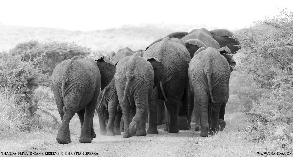 The Thanda guests on my vehicle enjoyed the fast drive to catch up with these gentle giants when they were on the way to the next waterhole. And we just caught them as they crossed the road in front of us.