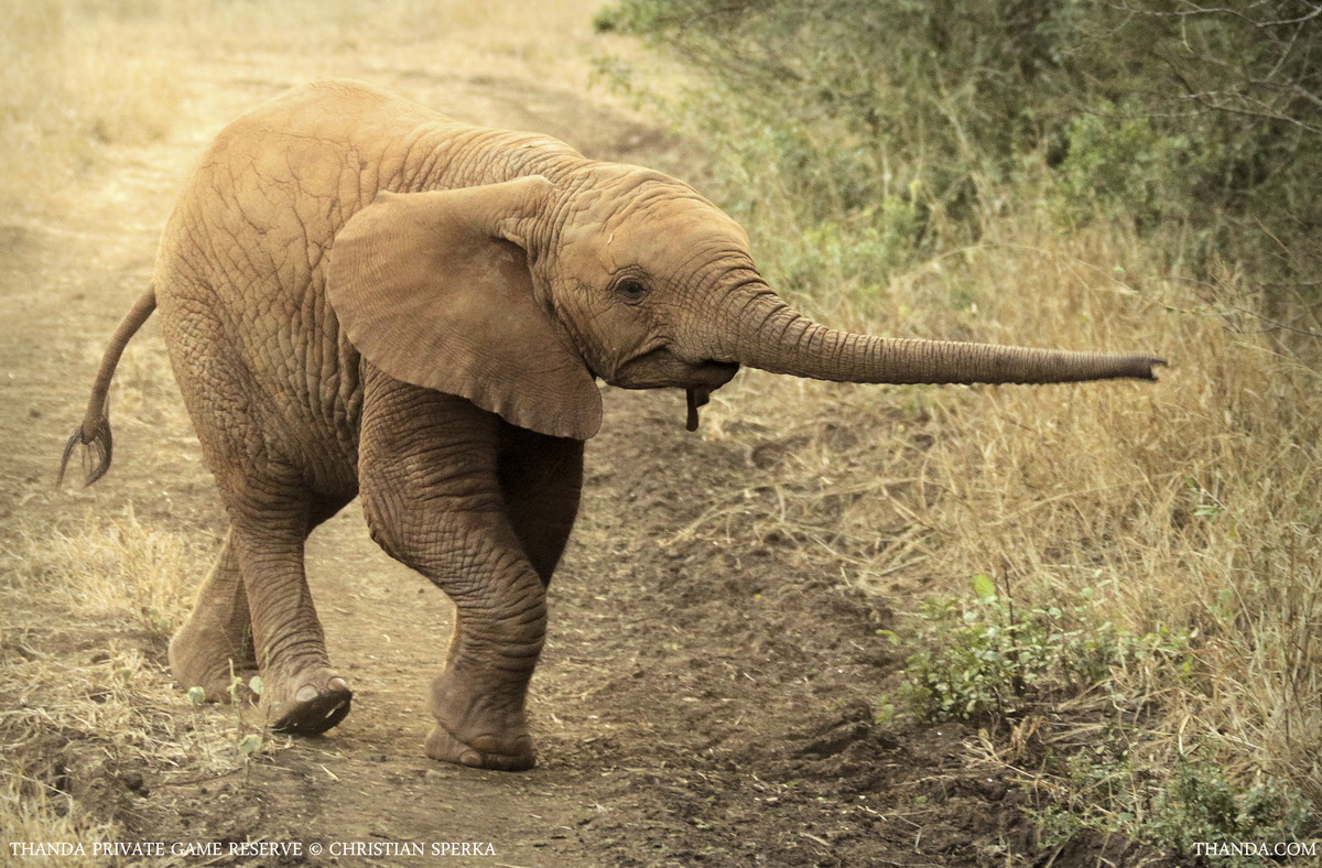 One of Thanda’s largest Elephant bulls was standing still for a few seconds – for his close-up pictures 🙂 – before he moved on down the hill. This gentle giant was trailing the breeding herd which had crossed the road in front of the vehicle on the way to a nearby waterhole. What an experience for the Thanda guests!