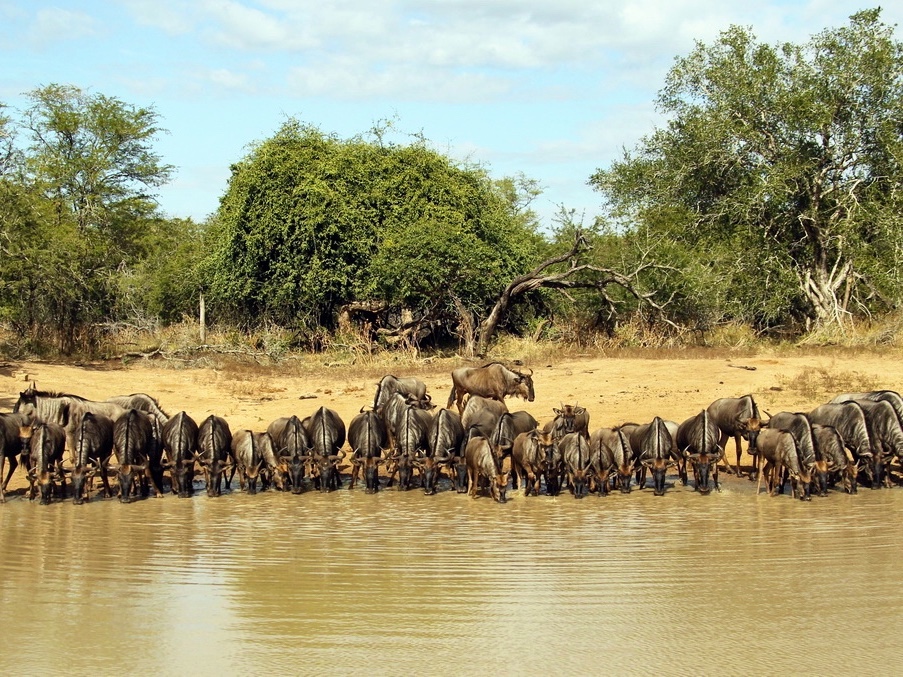 During the heavy rains, I took a short drive on our main roads (as all the others were impassable due to the soggy ground) but only encountered two animal species. A single Wildebeest bull was guarding his territory, and three African Spoonbills were standing completely drenched next to a waterhole. Most animals seek shelter in dense bushes during downpours.