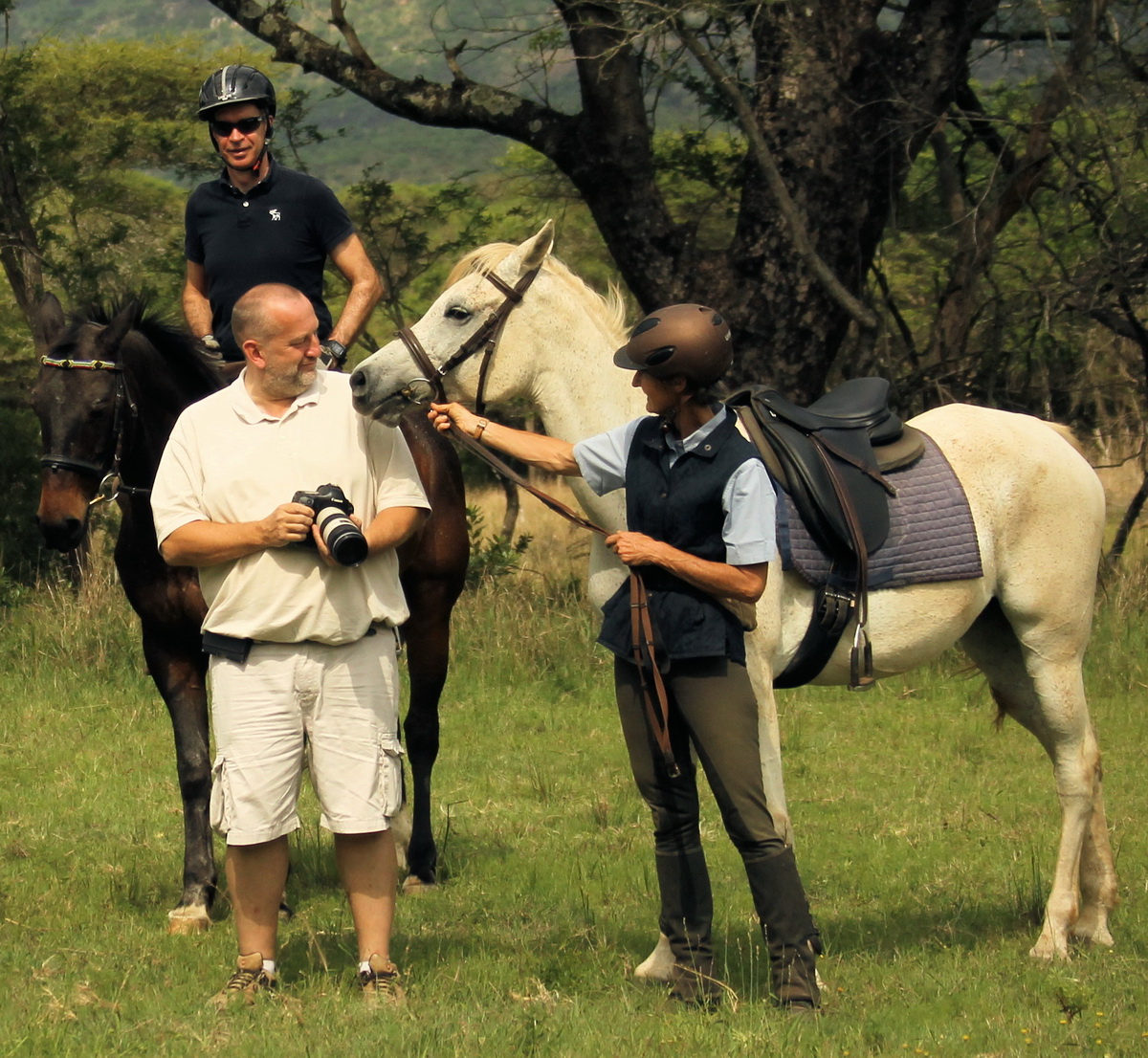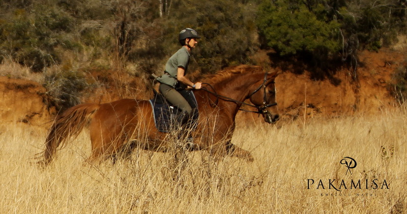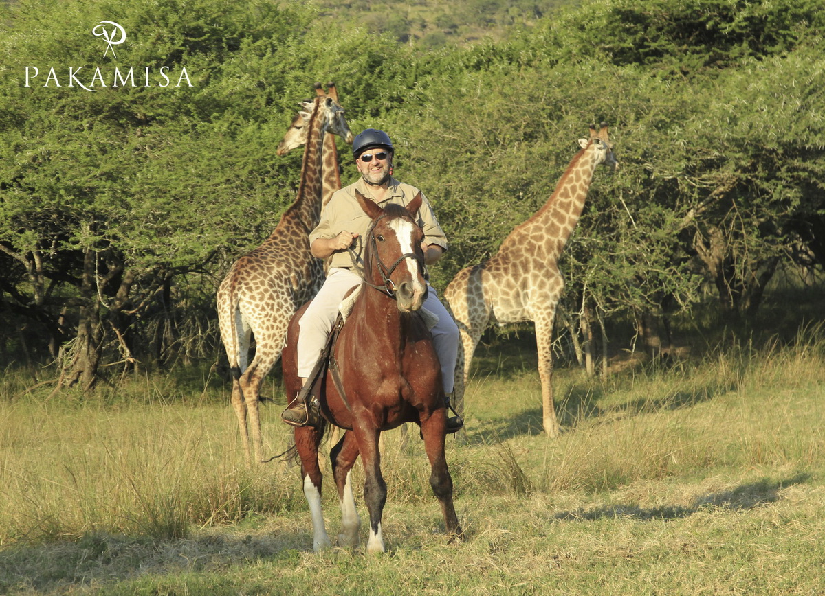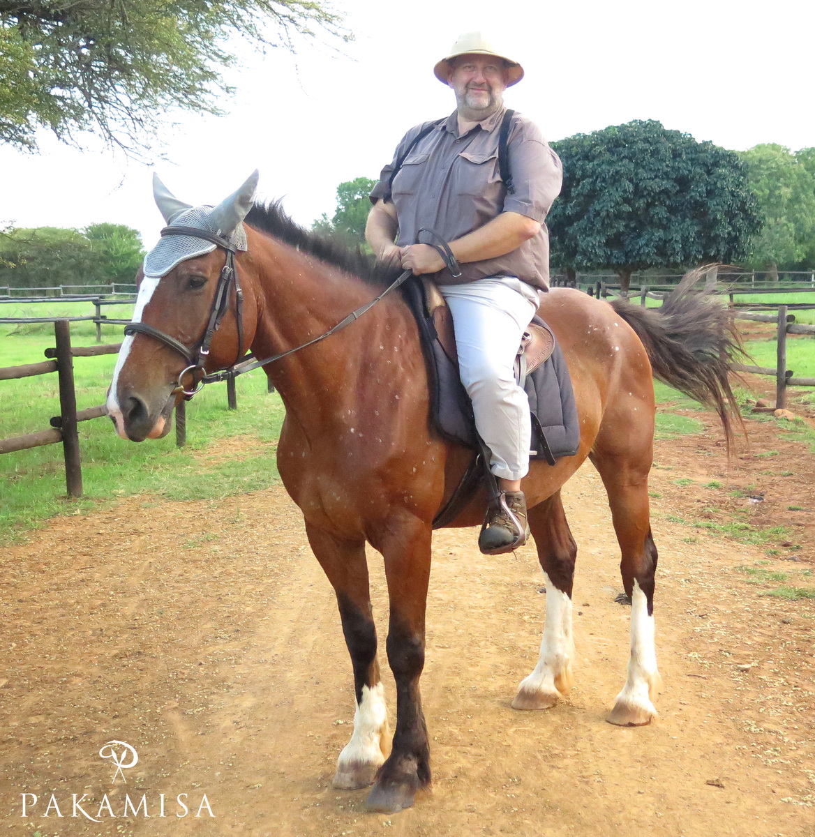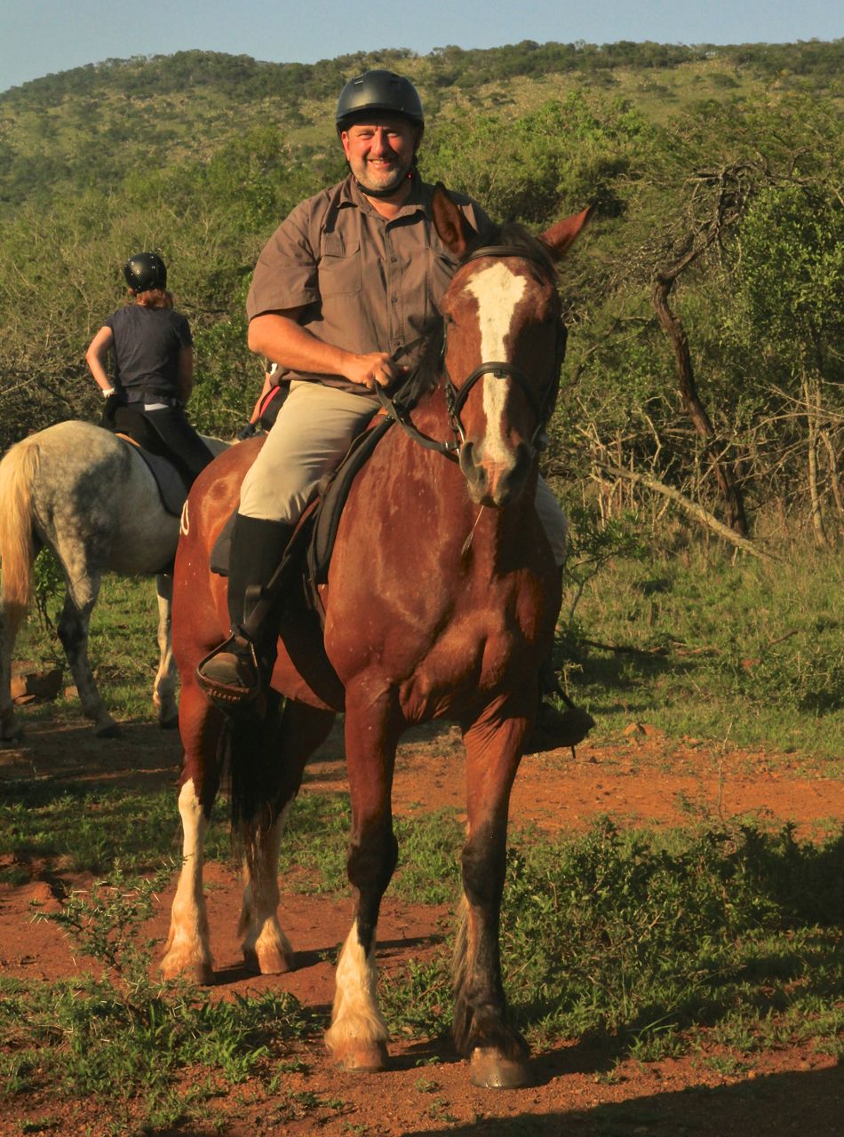 … Mark – a Pakamisa guest – on Zulu (a Boerperd) smiling at the unusual scene with me posing in front of the camera :-).