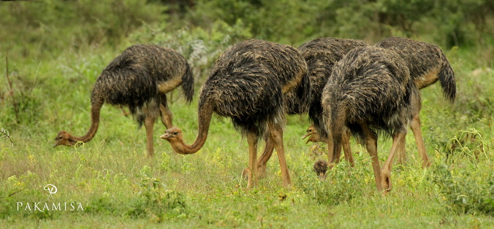 The second one shows Pakamisa’s Ostrich family at their evening dinner – dad, mum and 16 little Ostriches.