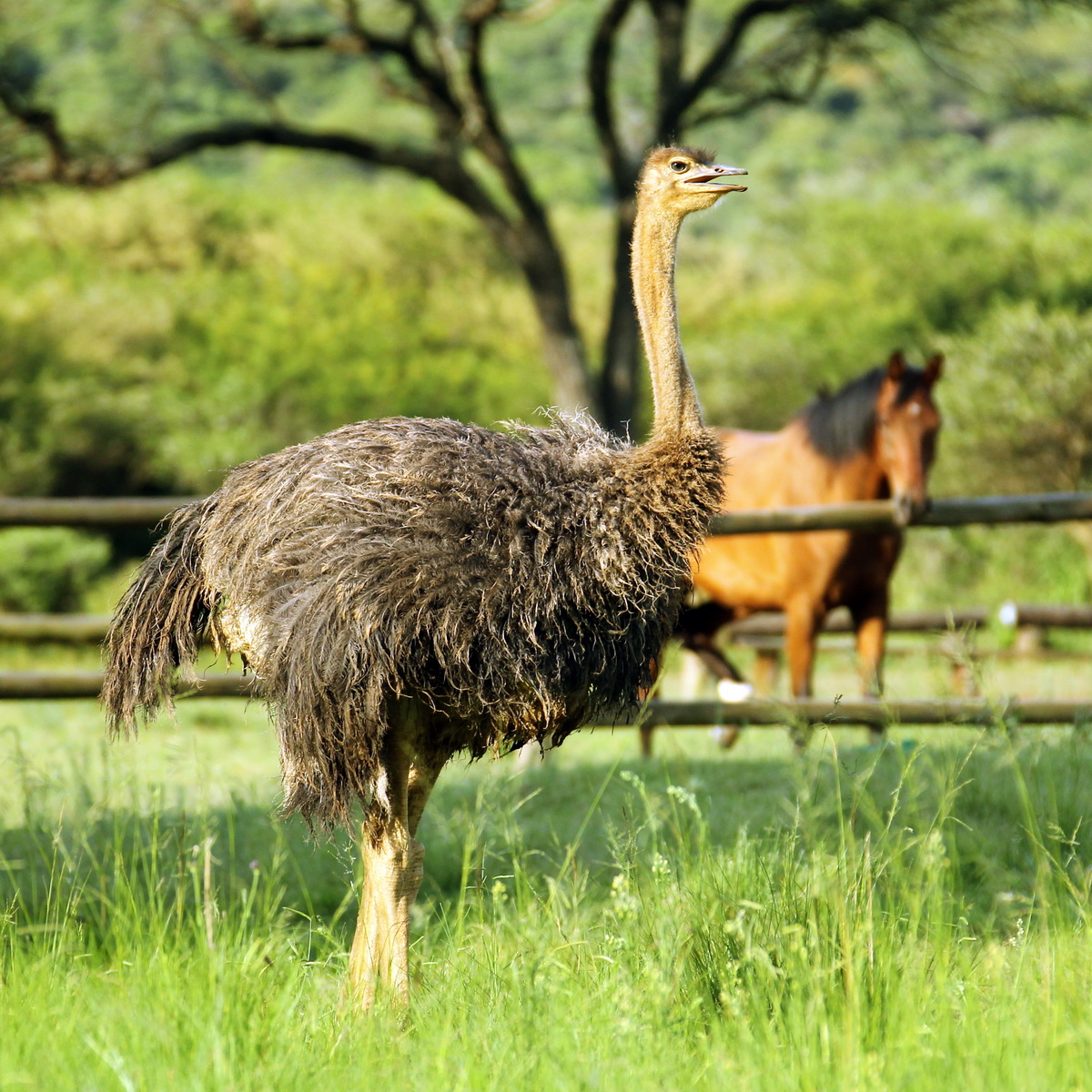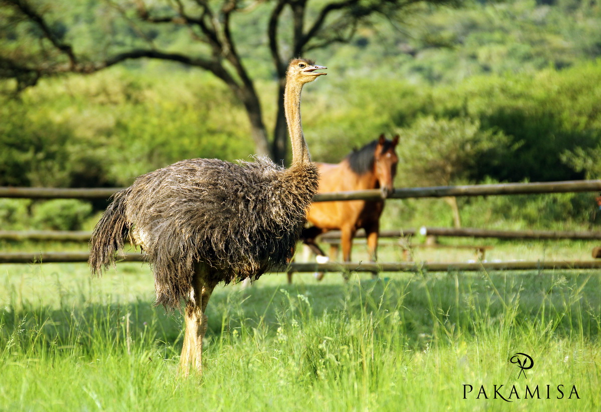 20150108 - CS2_9773 - PThis young Ostrich was observed by one of Pakamisa’s mares as it moved towards the stables for its evening dinner!