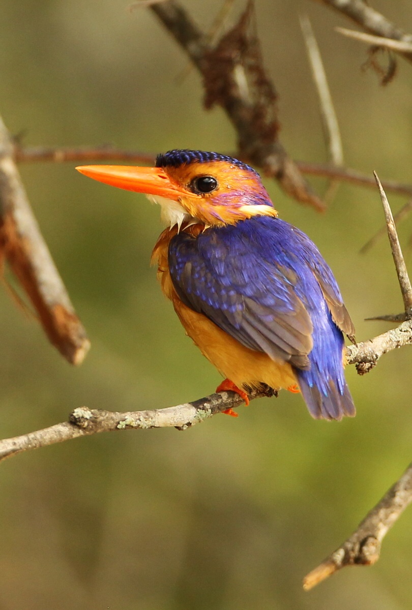 Four of them (Woodland Kingfisher, Striped Kingfisher, Brown-hooded Kingfisher and African Pygmy Kingfisher) are regularly seen on Thanda Safari Private Game Reserve and I had one – rare – sighting of a Malachite Kingfisher. Giant Kingfishers, Mangrove Kingfishers and Pied Kingfishers are aquatic species and are therefore not resident on Thanda.