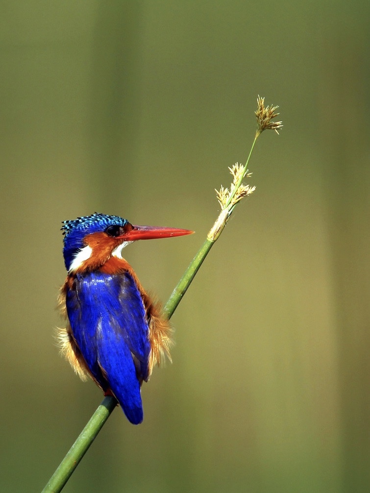 The Malachite Kingfisher (Corythornis cristatus) is an aquatic, small Kingfisher which is widely distributed in Africa south of the Sahara. It is only 13 cm (5.1 in) in length. This species is common to reeds and aquatic vegetation near slow-moving water or ponds. The flight of the Malachite Kingfisher is rapid, with the short, rounded wings whirring until they appear a mere blur. It usually flies low over water. The call of this kingfisher is then a short shrill seek. The breeding song is a chuckling li-cha-cha-chui-chui.