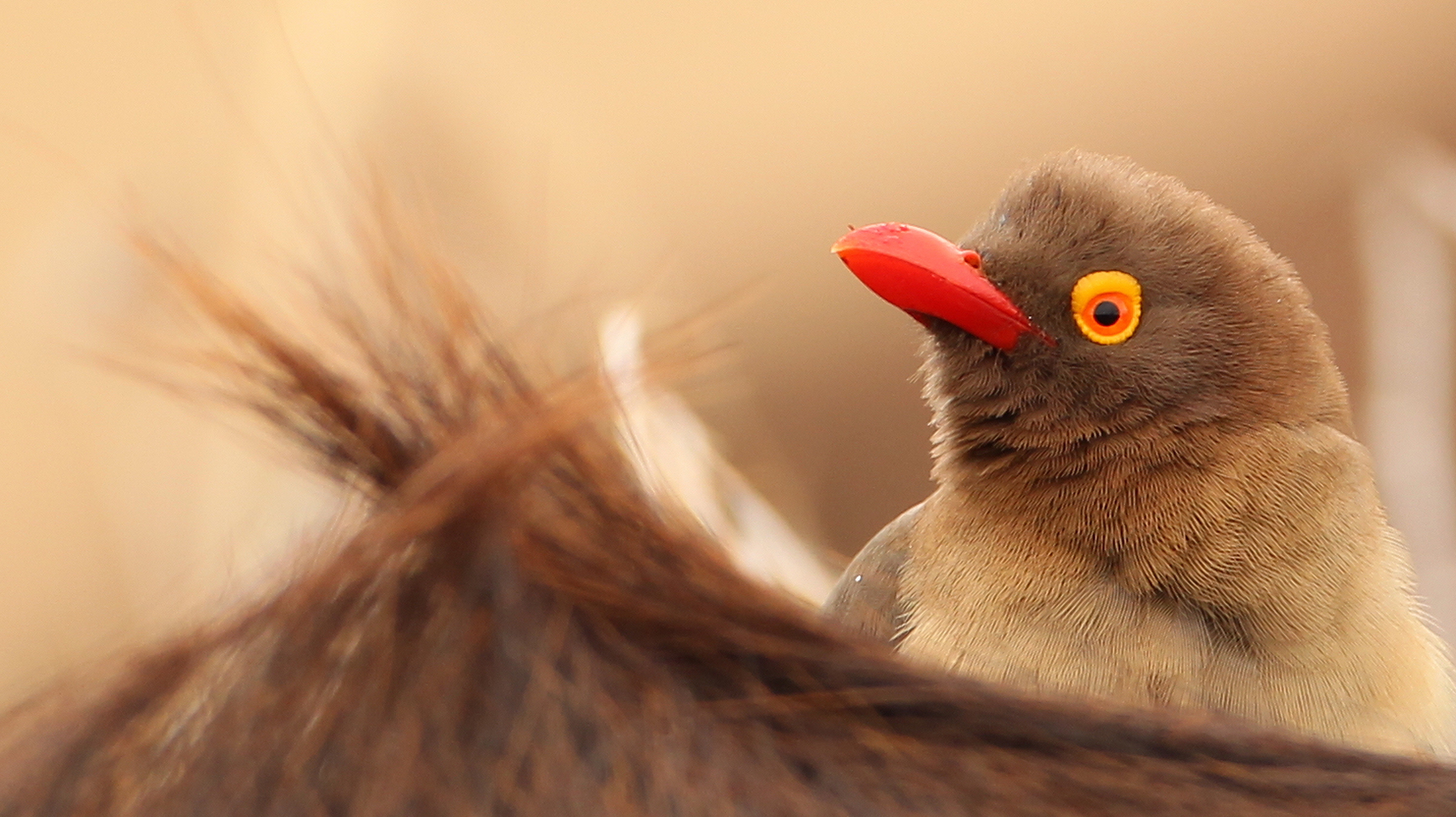 The fourth picture is of a bunch of Red-billed Oxpeckers riding on the back of a Buffalo. The Buffalos, like most large mammals, love the Oxpeckers because they eat the Ticks of their back.