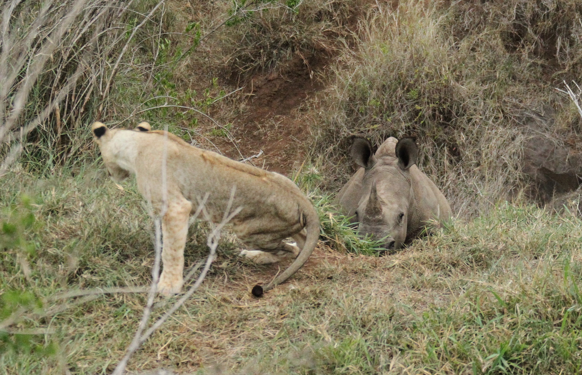 Not really! The small Lion cubs had to give up their ‘hunt’ – the White Rhinos were a bit big for them – The Lion mothers watched the scene bemused from a distant …