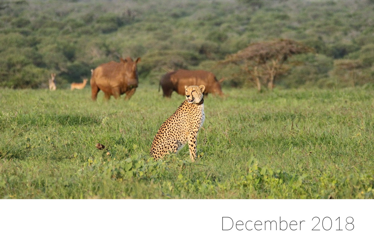 Summer rains have started properly and the savanna is turning green again. Our new Cheetah males love the open areas which they share with many species. In this December image Zebras, Impalas and Rhinos are posing in the background for this Cheetah portrait.