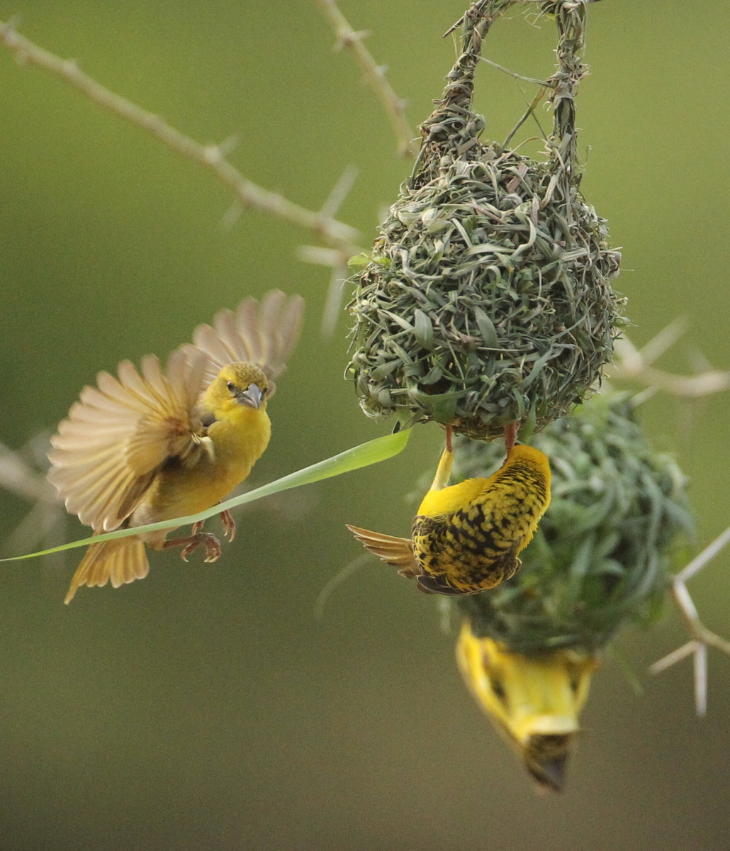 Inspection – A female Village Weaver (left) inspecting the nest of a potential mate …