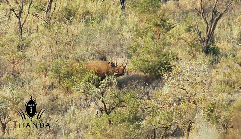 With two guest from Germany – staying for 12 nights at Thanda – we planned some game drives in rather remote areas of the reserve. When we drove in a very hilly area we spotted a Black Rhino moving fast across the opposite site of a valley.