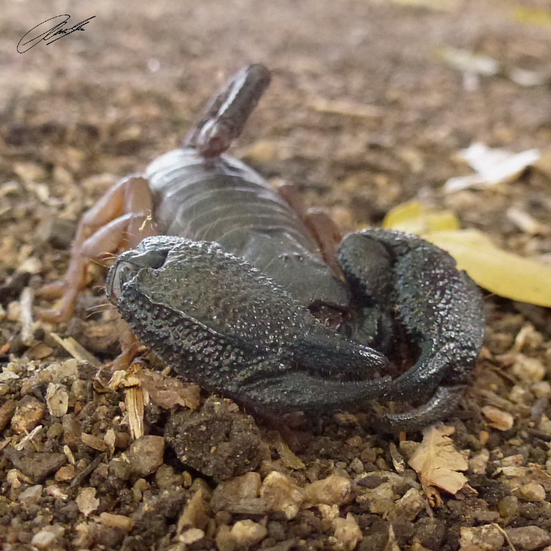 Scorpions are predatory arthropod animals. They have eight legs and are easily recognized by the pair of grasping claws and the narrow, segmented tail, often carried in a characteristic forward curve over the back, ending with a venomous stinger. Scorpions range in size from 9 mm to 20 cm.