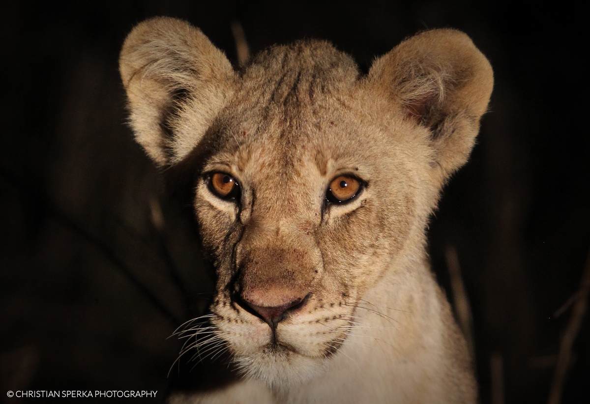 I do not really like to work at night with artificial light. But sometimes this sort of light creates a very special mood. Using a diffusing filter on Bheki’s strong spotlight I was able to take a portrait of this Lion cub. The soft widely spread light through the filter is not too hard on the young eyes and we only use it for a few moments during the photo shoot. The rest of the time we use a red-light filter.