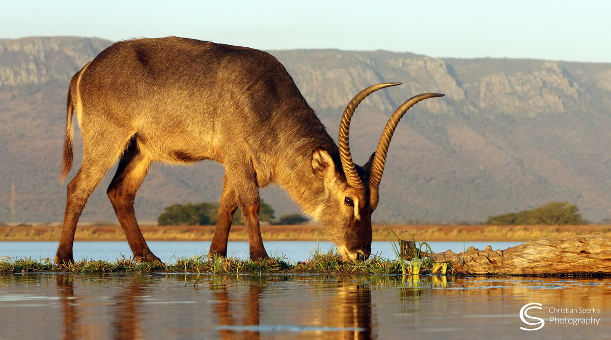This Waterbuck image was taken with late afternoon light at the Lagoon Hide on Zimanga Private Game Reserve. The hide mostly attracts water birds … and some mammals 🙂 . The Lebombo mountains provide an excellent backdrop.